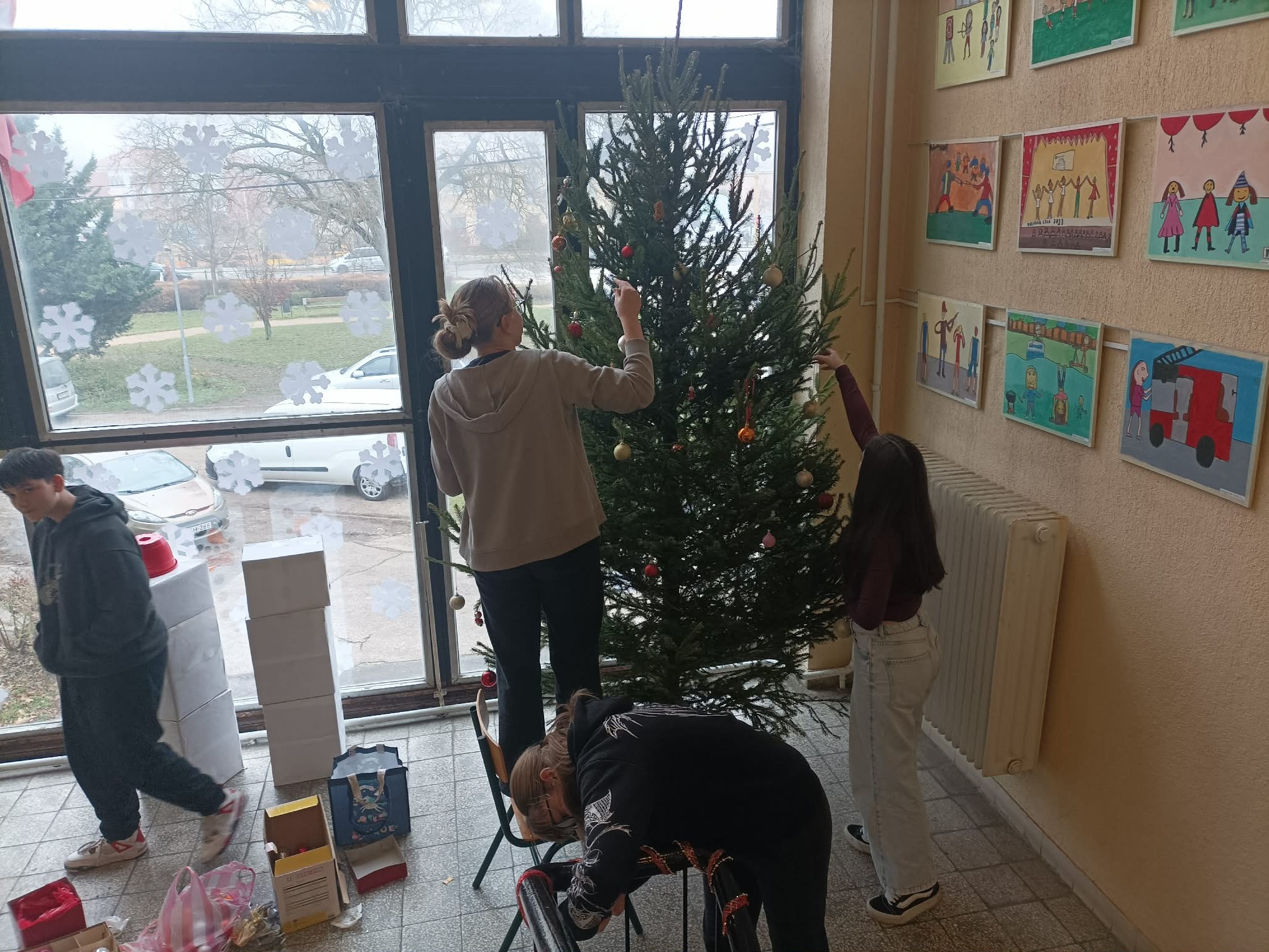 A szakkörösök egy része a szinpad előtt téli átállásként kerékpárt szerelt, a másik része a belső udvarban teszelt.